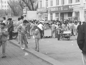哈市风华中学附近,学生们围住“路边摊”,解决午饭。
