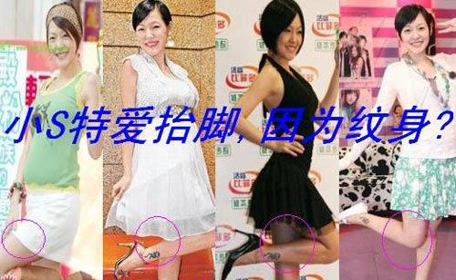 以为人母的小S,常常会爱摆一些漂亮可爱的造型出来。不过通常她有一个习惯性动作,那就是抬一只脚,一只手插着腰。可能是为了体现她脚上的小刺青吧!每回拍照总不忘把这个位置给秀出去。所以在同她姐姐合影时,大部分造型,小S总是侧着身体的。都是纹身给累的!
