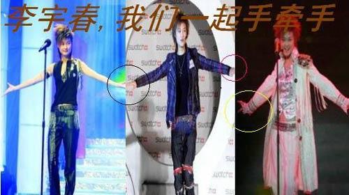 这个动作估计看过超女的都知道,就不要说是玉米啦!是首什么歌来着?反正只要是李宇春唱这首歌,这双手就得先来个180度的大张开,而且必需是一抖一抖好像在散星星的那种,且要微笑着看着前方的观众。