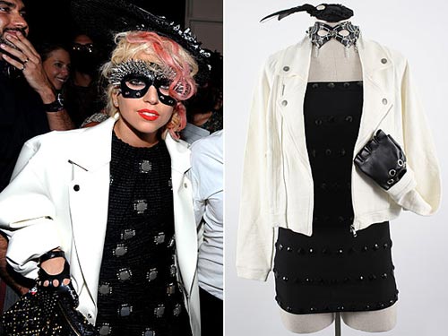 纽约时装周中,Gaga很戏剧性的穿了一身黑色钻饰小礼服和铆钉面具。