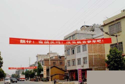近日,有网友在论坛发贴,并上传一张图片,图片上有一条横跨公路的征兵横幅,上面写着:“靓仔,有搞头吗?没有就参军去吧!”发帖网友称这是在广西平乐县二塘镇街上所拍的,网友们把它誉为“最雷人的征兵横幅”。据了解,如此雷人的横幅,是当地村民制作的。