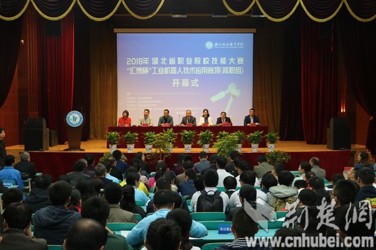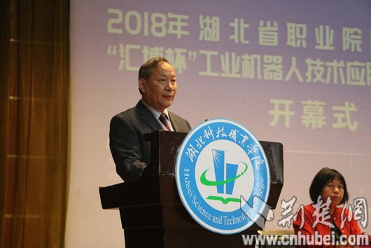 作为2018年湖北省职业院校技能大赛子赛项,工业机器人技术应用赛项(高职组)由省教育厅主办、湖北省教育科学研究院承办、湖北科技职业学院协办,江苏汇博机器人技术股份有限公司和华中数控股份有限公司提供技术支持。赛项开幕式由赛项执委会副主任、湖北科技职业学院副校长宋移安主持。